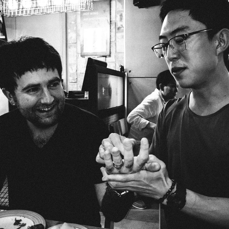 Me writing Korean into Josh's hand